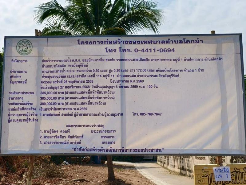 description วันพุธที่ ๔ มีนาคม ๒๕๖๙ คณะกรรมการตรวจรับพัสดุเทศบาลตำบลโคกม้าได้ตรวจรับ โครงการก่อสร้างรางระบายน้ำ คสล. ซอยบ้านนางอิ่ม ชนะชัย จากแยกถนนวงเมืองถึง ศาลาประชาคม หมู่ที่ ๑ บ้านโคกกลาง ตำบลโคกม้า อำเภอประโคนชัย จังหวัดบุรีรัมย์ ปริมาณงานรางระบายน้ำ ค.ส.ล.ขนาดกว้าง o.๓o เมตร สูง o.๓o เมตร ยาว ๑๗๒.oo เมตร พร้อมป้ายโครงการ จำนวน ๑ ป้าย person สำนักปลัดเทศบาล